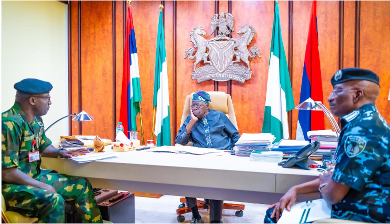 President Tinubu held an extended security briefing with all Service Chiefs, including the Inspector-General of Police, the Director-General of the DSS, and heads of other intelligence agencies at the State House on Monday evening.